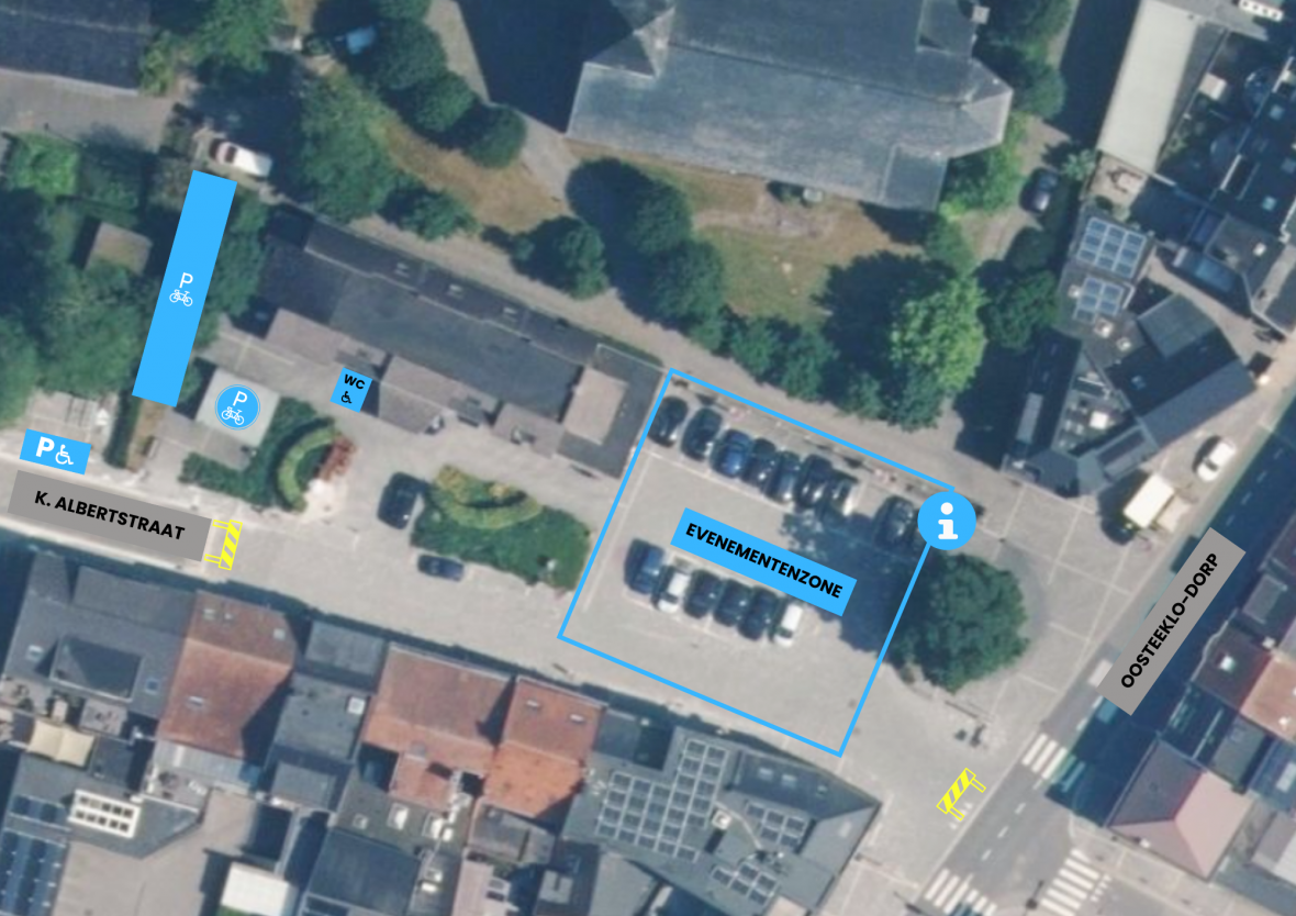 - Extra parkeerplaatsen voor mindervaliden zijn voorzien ter hoogte van Koning Albertstraat 10. Deze zijn bereikbaar via de Rijkestraat, aangezien de Koning Albertstraat aan het dorpsplein afgesloten is. Van daaruit bereik je eenvoudig de evenementenzone.